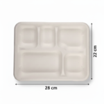 This 11” (28cm) x 9”(22cm) rectangular container with lid is expertly crafted from sugarcane. It features five distinct compartments for organized presentation. Finished in white, this professional container measures 28cm in length, 22.0cm in width, and 3.5cm in height, with a lightweight design weighing 34 grams.