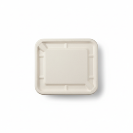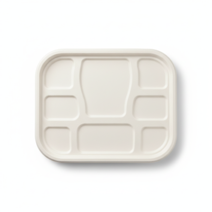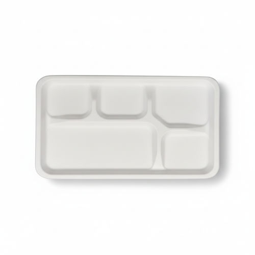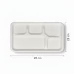 This white 11” (28cm) x 9”(23cm) rectangular tray is crafted from sugarcane, featuring five compartments for organized serving. With dimensions of 28cm length, 23cm width, and 1.4cm height, and weighing 25 grams, it offers a lightweight and functional solution.