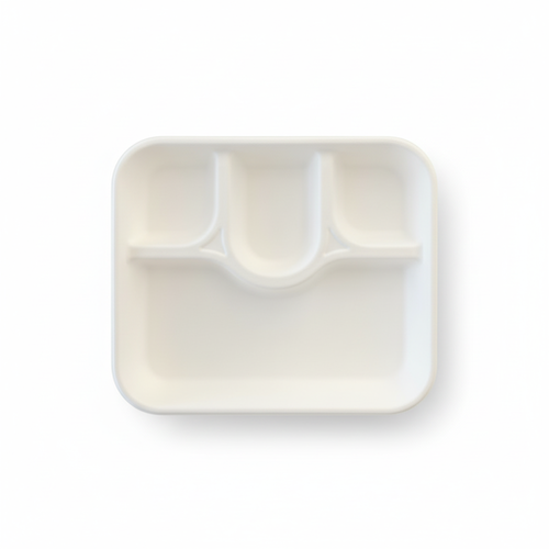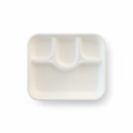 The 4 Compartment Meal Tray – XL is a white, rectangular tray crafted from sugarcane. Featuring four distinct compartments, it measures 30cm in length and 24cm in width. This tray, with a height of 3.5cm and weighing 30 grams, offers a clean and organized solution for serving multiple food items.