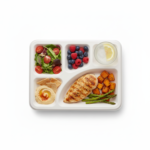 Introducing the 12” (30cm) x 9” (23cm) 5 compartment Sugarcane Rectangular Tray, a professional solution for organized meal presentation. This white tray is precisely designed with five individual compartments, enabling efficient separation and display of various food items. Crafted entirely from sugarcane, it presents a clean and professional aesthetic suitable for diverse serving requirements.