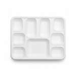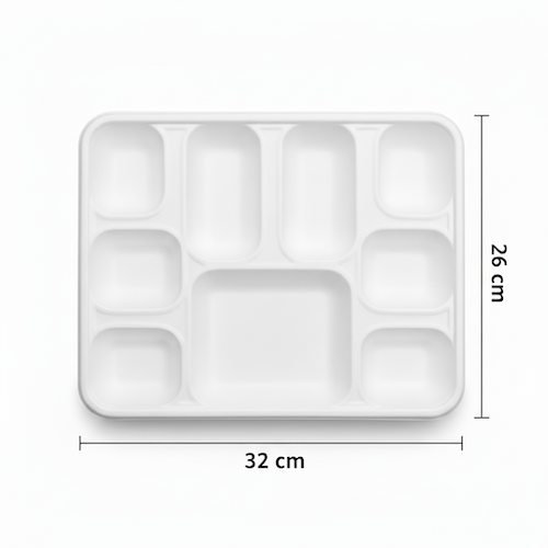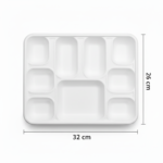 This 9 Compartment Rectangular Tray is crafted from sugarcane, offering a clean and functional design. Measuring 32cm (13”) in length, 26cm (10”) in width, and 3.1cm in height, it features nine distinct compartments. Each white tray weighs 58 grams, providing a lightweight yet structured solution.