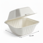 The 15oz (450ml) Sugarcane Square Clamshell is a white, single-compartment container crafted from sugarcane. Measuring 15 cm in length, 15 cm in width, and 8 cm in height, it offers a 450ml (15 oz) volume. This lightweight square clamshell weighs 29 grams, providing a clean and professional packaging solution.
