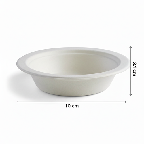Each bowl measures 10cm in diameter and has a height of 3.1cm, offering a compact yet functional capacity. With a volume of 120ml (4.0oz) and weighing just 5 grams, these bowls are designed for ease of handling and efficient use. The precise dimensions and specific material ensure consistent performance. This Sugarcane Round Bowl is presented in a crisp white variant, emphasizing its clean design and suitability as a fundamental bowl type.