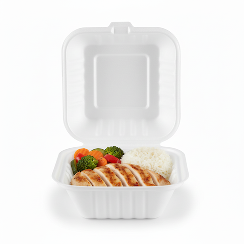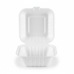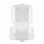 Presenting the 6” Sugarcane Square Clamshell, crafted from durable sugarcane material in a clean white finish. This single-compartment clamshell measures 15cm in length, 15cm in width, and 7.6cm in height, weighing 21 grams. Its square shape and secure clamshell design make it a practical solution for various items.