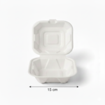 The 6”(15cm) Sugarcane Square Clamshell is a single-compartment container made from sugarcane. This white, square clamshell measures 15cm in length and width, with a height of 8.7cm. Weighing 20s grams, it offers a functional solution for containment.