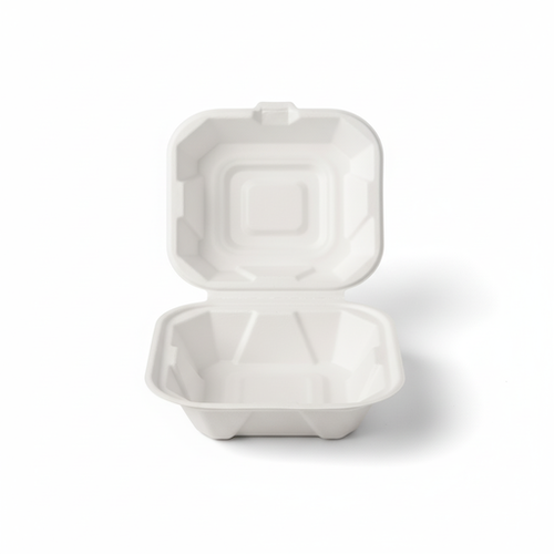 The 6”(15cm) Sugarcane Square Clamshell is a single-compartment container, crafted from sugarcane material. This clamshell features a square shape and is presented in a white colour, offering a uniform appearance.