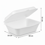The 7” (18cm) x 5”(13cm) Sugarcane Rectangular Clamshell is a single-compartment container made from sugarcane. Measuring 18cm (Length) x 13cm (Width) x 9.1cm (Height), it provides a 600ml (20.0 oz) volume. This white, rectangular clamshell is designed for practical use.