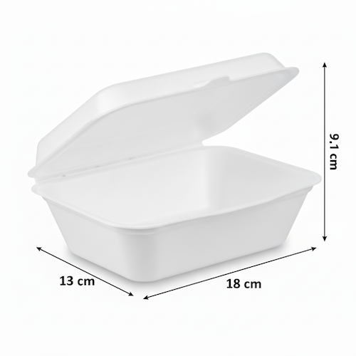Introducing the 7” (18cm) x 5”(13cm) Sugarcane Rectangular Clamshell, a versatile single-compartment container crafted from sugarcane. This rectangular clamshell offers a practical solution with precise external dimensions: 18cm in length, 13cm in width, and 9.1cm in height. It provides an internal volume capacity of 600ml, equivalent to 20.0 oz, making it suitable for a variety of contents. Each unit weighs 31 grams, reflecting its lightweight design. Presented in a clean white colour, this sugarcane clamshell combines functionality with a professional aesthetic for diverse applications, featuring one compartment to hold items securely.