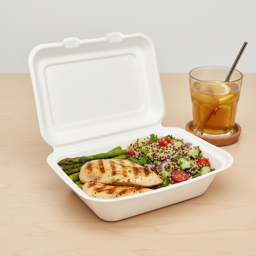 The 7” (18cm) x 5”(13cm) Sugarcane Rectangular Clamshell is a professionally designed, single-compartment container. Expertly crafted from sugarcane, this clamshell provides a clean and practical solution for various packaging needs. Its sturdy rectangular shape measures 18cm (7 inches) in length, 13cm (5 inches) in width, and 9.6cm in height, offering generous internal space. With a substantial volume of 600ml (20.0 oz), it is suitable for holding a variety of contents. The container presents a crisp white appearance, available consistently in this white variant. Each unit weighs a mere 32 grams, making it lightweight for handling. This rectangular clamshell, defined by its precise dimensions and sugarcane material, combines functionality with a professional aesthetic.
