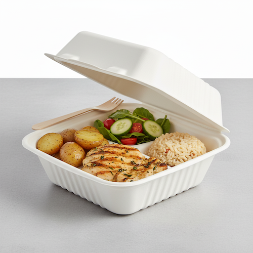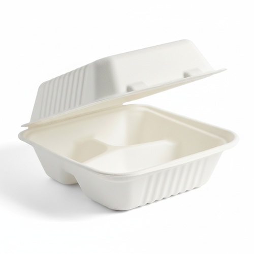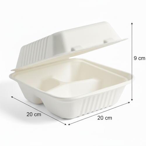 The 8”(20cm) 3 compartment Sugarcane Square Clamshell offers a professional and organized containment solution. Constructed from sugarcane, this square clamshell box is distinguished by its three dedicated compartments, designed for efficient separation and presentation.