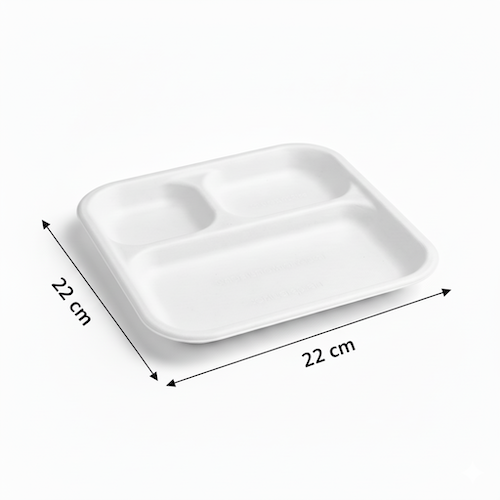 Each plate measures 22cm in length and 22.0cm in width, with a consistent height of 2.4cm, offering ample space within its segmented structure. Weighing 19 grams, this plate maintains a lightweight profile. The 3 Compartment Sugarcane Square Plate is offered in two variants: White and Brown, allowing for a choice in finish. This plate combines specific dimensions with a functional, multi-compartment design suitable for various serving needs.