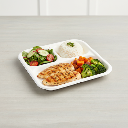Discover the 9” (22cm) 3 Compartment Sugarcane Square Plate, a structured solution for food presentation. This square plate is constructed from sugarcane, providing a defined choice for serving applications. Its design integrates three distinct compartments, which are ideal for keeping different food components separate and organized.
