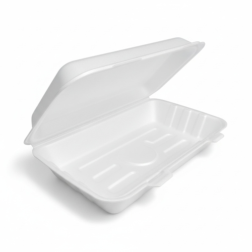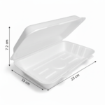The 9” (23cm) x 6”(15cm) Sugarcane Rectangular Clamshell is a precisely crafted product, identified by its material and design specifications. Constructed from sugarcane, this item presents a rectangular shape and operates as a clamshell type container. It features a single compartment, catering to specific packaging requirements. The exterior is finished in a clean white color, which is also the available variant for this product.