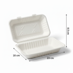 Presenting the 9” (23cm) x 6”(16cm) Sugarcane Rectangular Clamshell. This white, single-compartment container is crafted from sugarcane. It features precise dimensions of 23cm Length, 16.0cm Width, and 8.5cm Height, with a weight of 30s grams. A professional and functional rectangular clamshell.