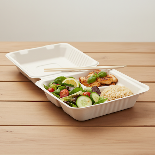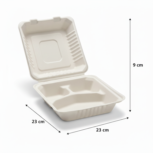 9”(23cm) 3 compartment Sugarcane Square Clamshell